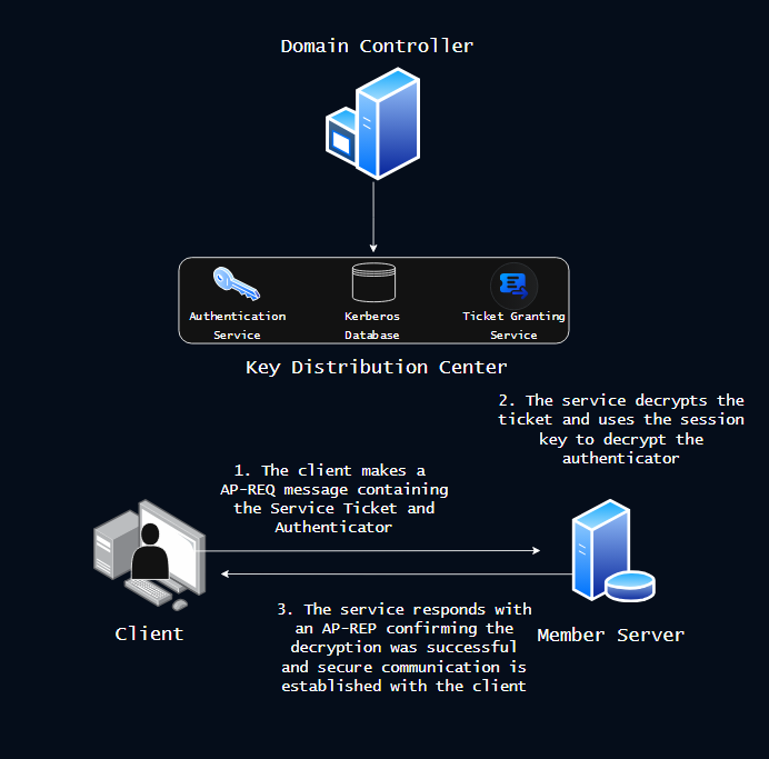 Member Server: This is the server on the domain with the asset/service that the client is attempting to access. For example, the resource could be a SMB share (\wk01.domain.com\SharedFolder). In essense, clients initiate actions, servers respond.