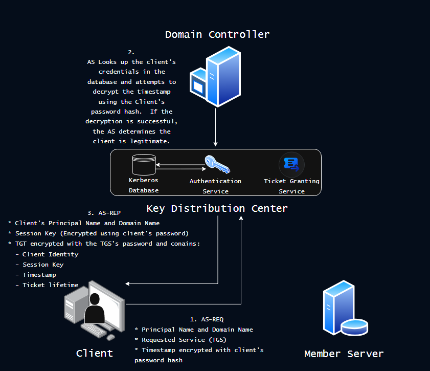 The authentication process beings with the client authenticating itself to the KDC by initiating what’s called an Authentication Server Request (AS-REQ). The AS-REQ message contains information about the client such as the client’s principal name, the service being requested (TGS), and a timestamp encrypted with a key that is derived from the client’s password.