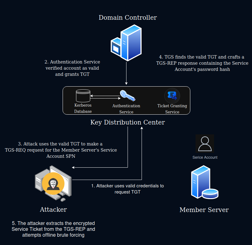 Because the ticket is encrypted using a key that is derived from the service’s password, the attacker can request a Service Ticket, extract the password hash, and attempt offline brute forcing to guess the password.