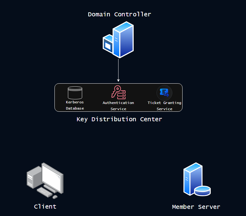 Key Distribution Center: The Key Distribution Center (KDC) is the trusted third-party in the domain. The KDC is always a Domain Controller in Active Directory and is the ultimate authority of managing authentication, distributing tickets, and determining the identity of clients and resources.