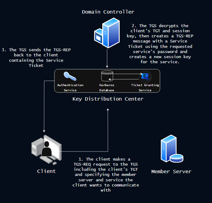 Now that the client has authenticated itself to the KDC, the client needs to use its TGT to request access to the member server it wants to interact with. This request is called a Ticket Granting Service Request (TGS-REQ). The TGS-REQ is, in many ways, identical to the AS-REQ. The only differences being that the messages includes the client’s TGT received from the AS-REP which is labeled in the TGS-REQ as “pre-auth data” and the TGS-REQ includes the names of the requested service. The TGS-REQ is handled by the Ticket Granting Service (TGS) rather than the Authentication Service (AS).