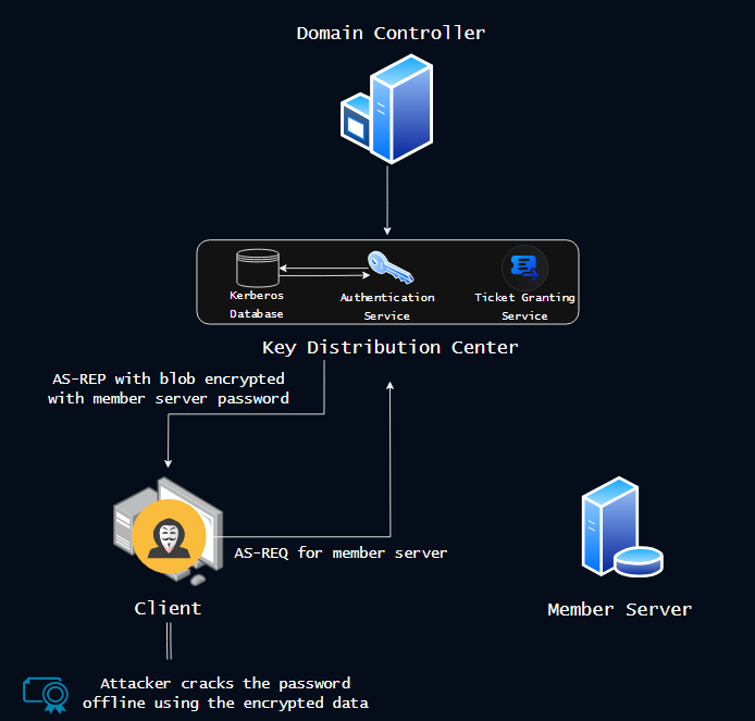 Kerberos can be configured so that pre-authentication is disabled, which means that when the KDC received an AS-REQ message, it doesn’t require an encrypted timestamp to check whether the AS-REQ message was made by a client that knew its own password. Instead, the KDC receives the AS-REQ and immediately returns an AS-REP with a TGT and a blob of data encrypted with a key derived from the client’s password.